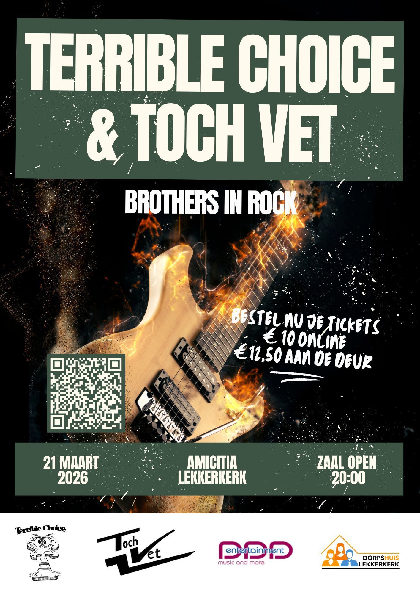 Op zaterdag 21 maart 2026 treden Terrible Choice en Toch Vet op in Lekkerkerk. Twee rockbands uit de regio gaan de strijd aan in “Brothers in ROCK” : een avond met achtereenvolgende live-sets vol stevige gitaren en lekkere rock.